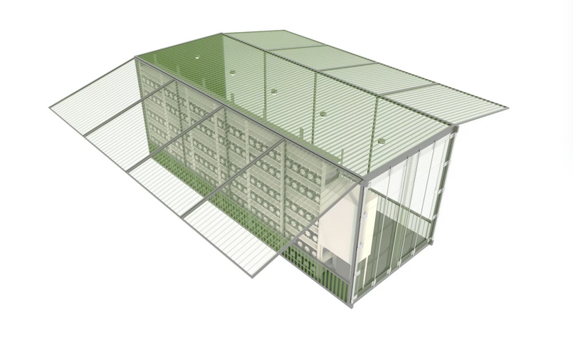 We designed special containers for the mining equipment, that have zero additional moving parts. All the air goes through from one end to another. In case of cold weather, hot air from the output is recirculated to the intake.