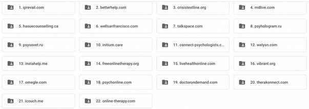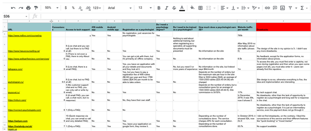 For each of these 22 competitors, we created a folder with detailed information on how to build the customer journey map (CJM), on how much the services of a psychologist cost, and on the rates. The folder also contains information on whether insurance can be used, on how much time it takes from the moment a user is registered on the site till he or she gets the long-awaited appointment with a psychologist, on whether one can choose one’s own psychologist or not, and a lot of other potentially useful information for building your own therapy platform.